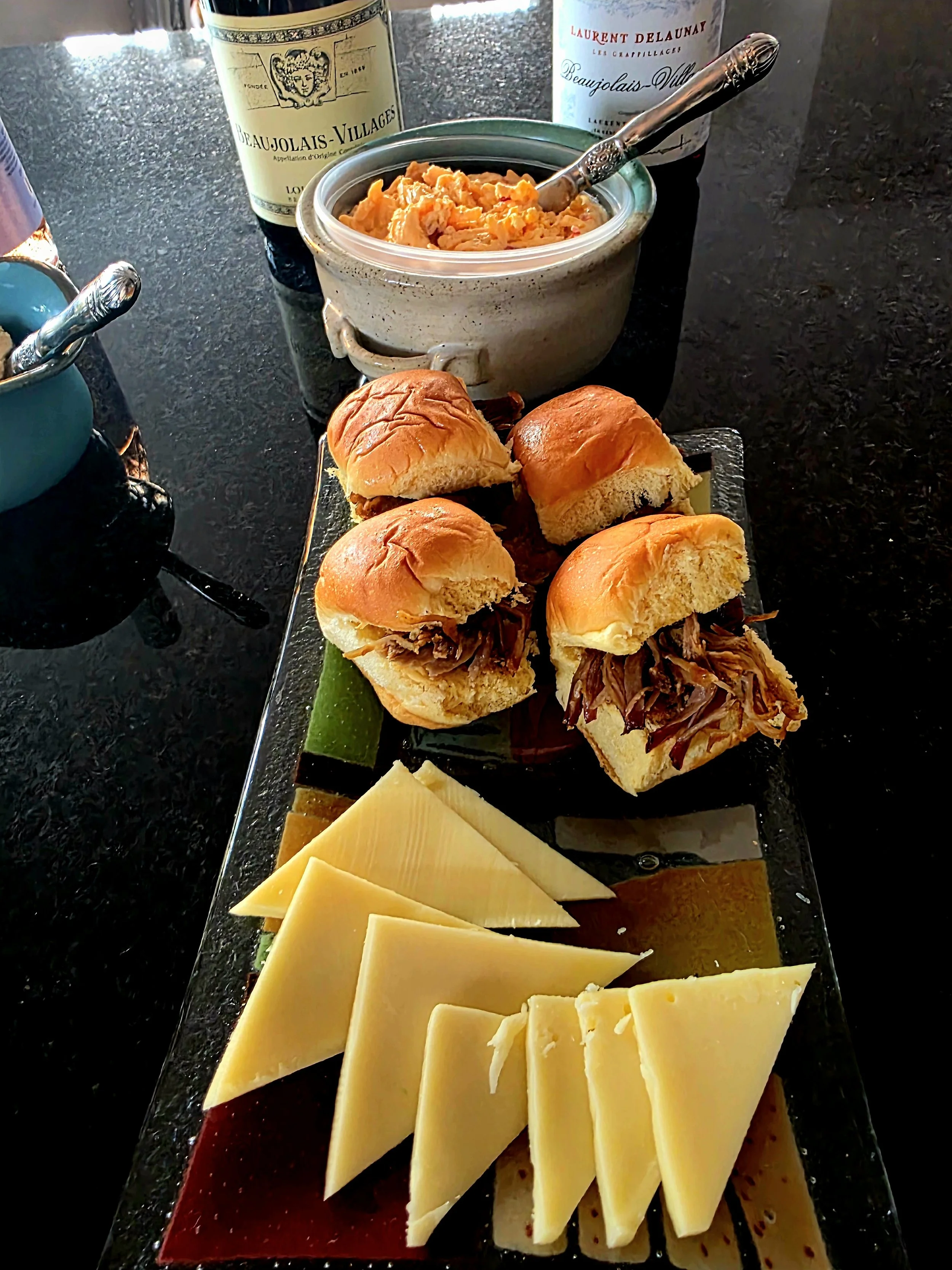 Once everything is purchased - we stage the pairing - it is a tough job, but we LOVE it!! In this example, we sampled several Proseccos and two different Beaujolais-Villages. We even tried the viral-tiktok about eating a pretzel with a grape tastes like fried chicken (which btw, is an excellent pairing with Champagne) - it just didn’t work for us or the Prosecco, so hard pass on that recommendation.